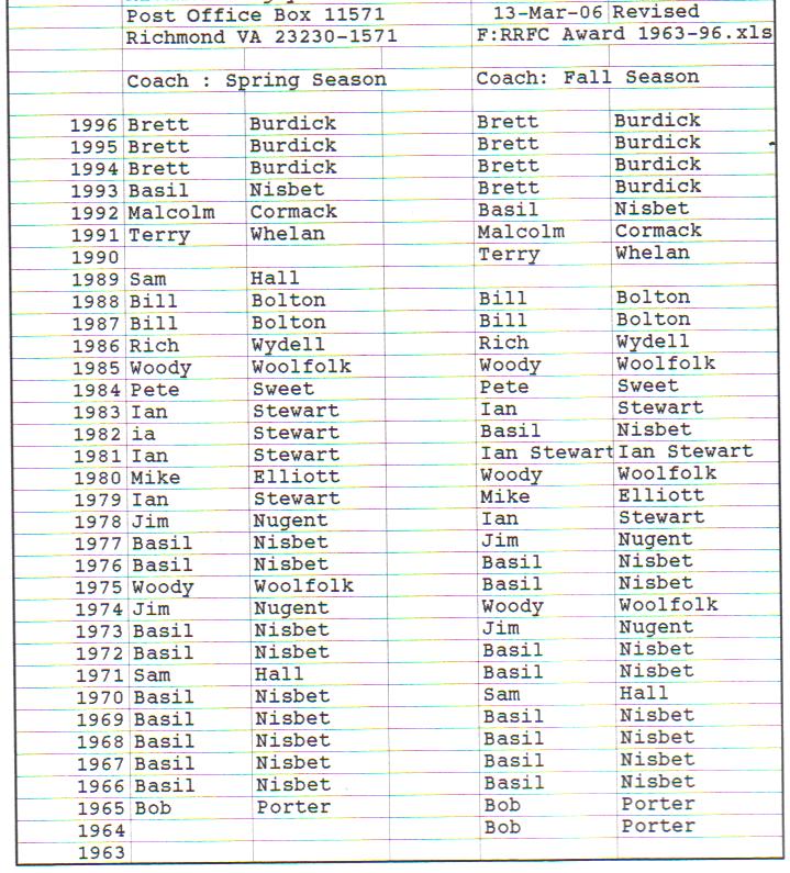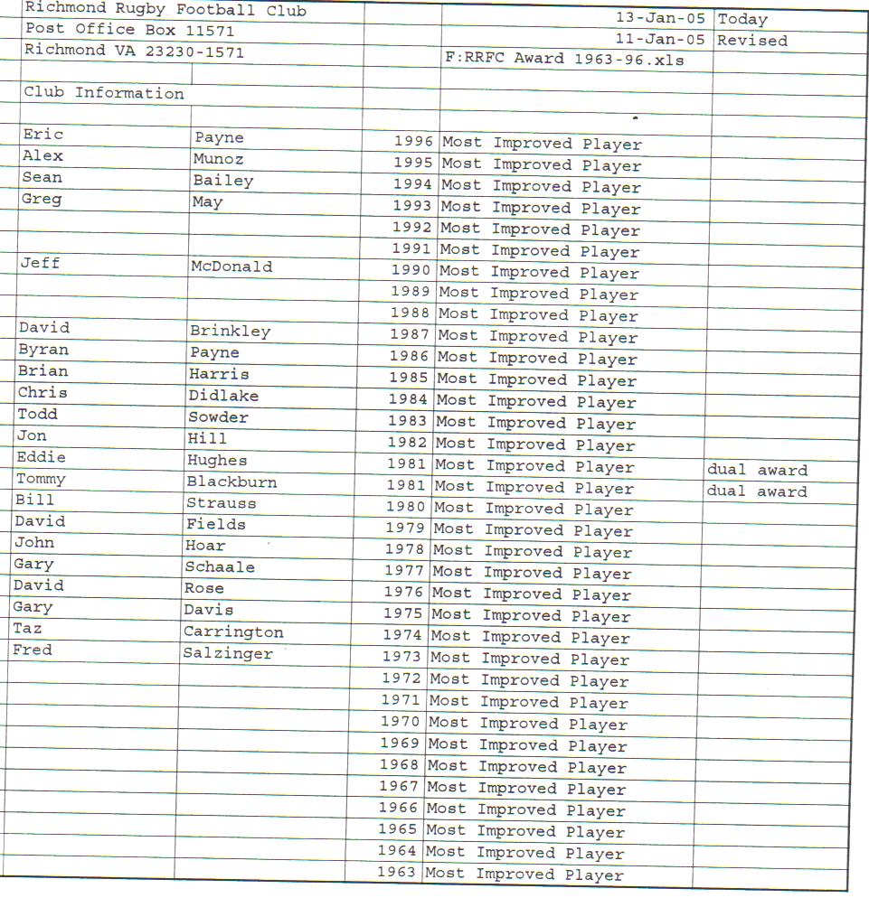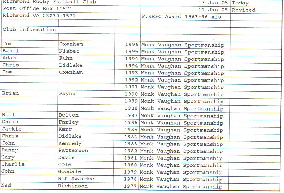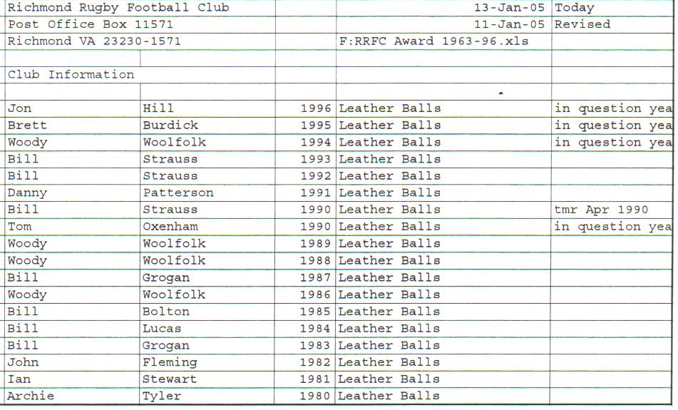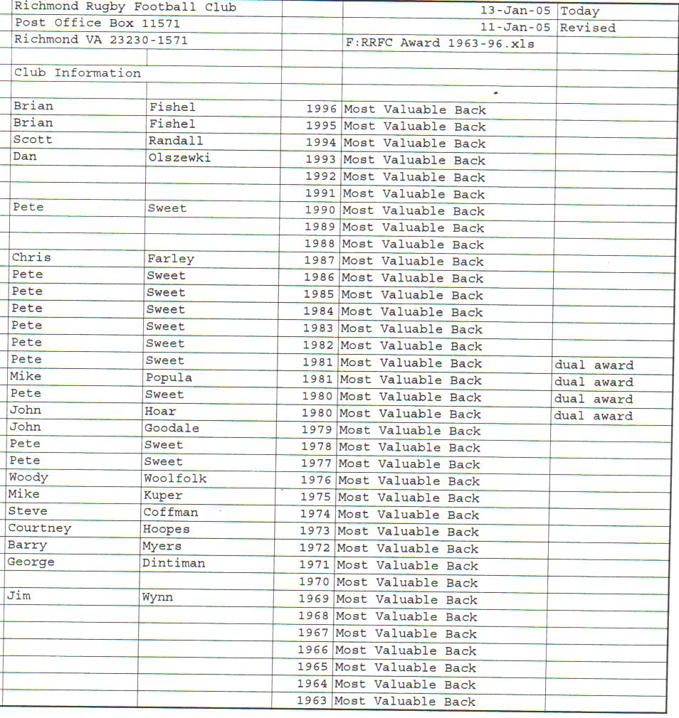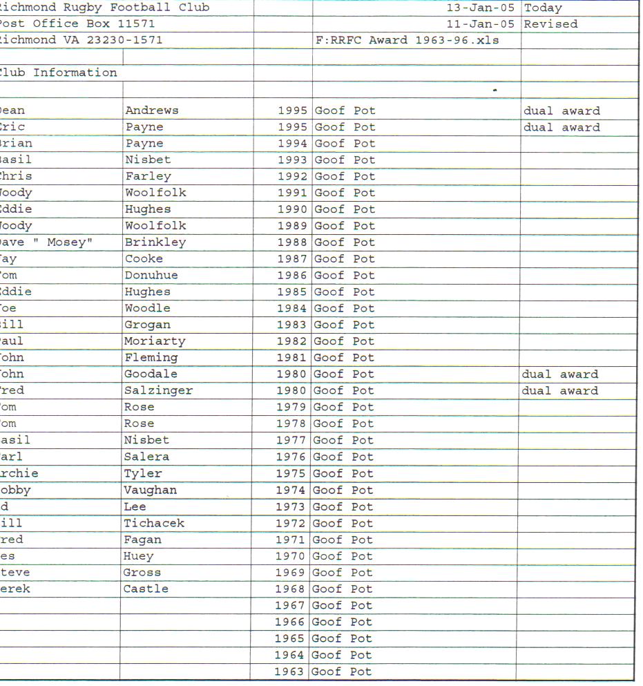 Presidents Coaches Captains Absent Friends Goof Pot Leather Balls Killer B Basil's Boot Most Improved Player Monk Vaughan Most Valuable Forward Most Valuable Back