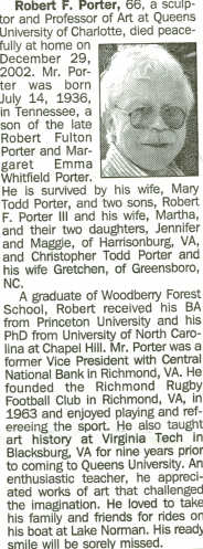 Robert Fulton Steamboat Porter, founder of Richmond Rugby Football Club,fierce original scrumhalf, originator of the Porter Rugby Cup,former Bank president, professor and Phd in Art History, sculptor, family man, man of all seasons passed away in the last days of 2002 after a long and courageous battle v illness over many years.