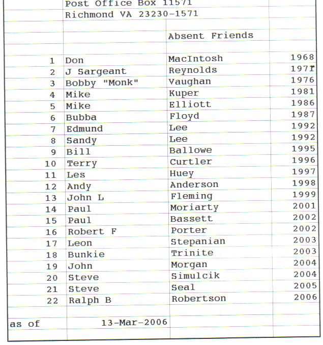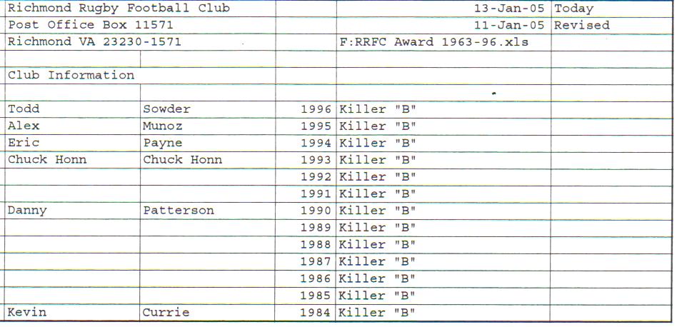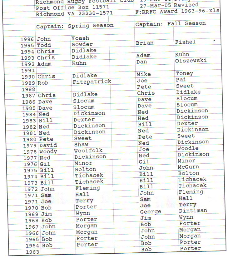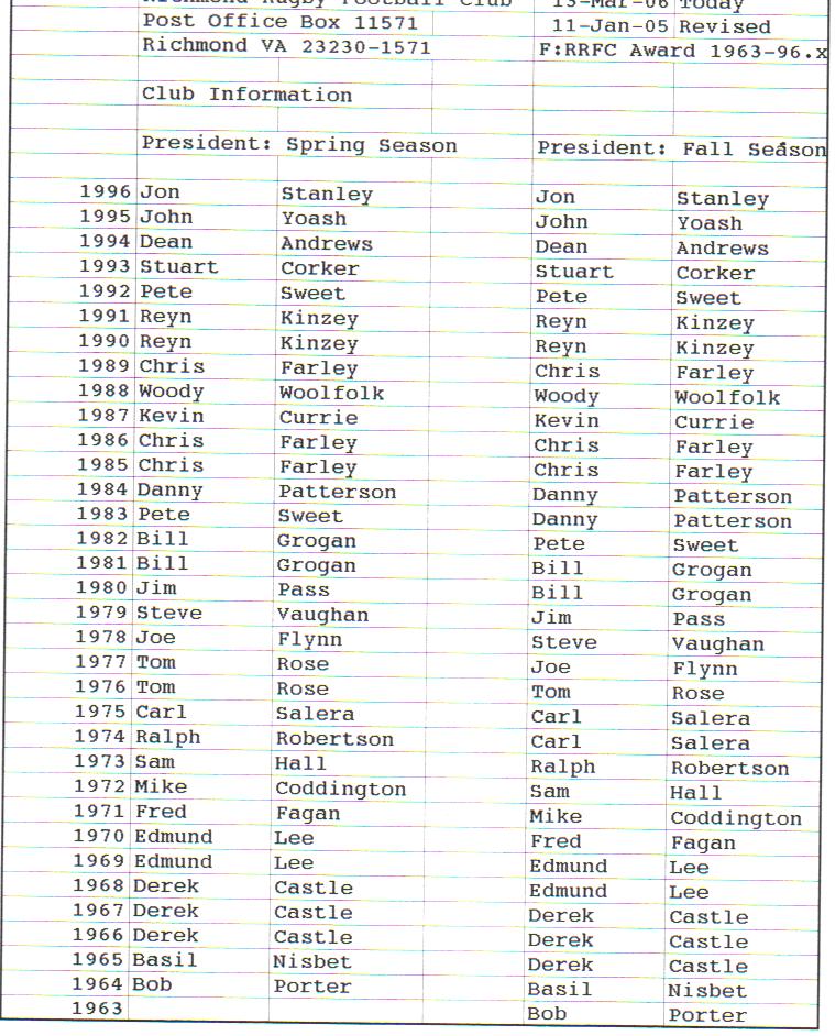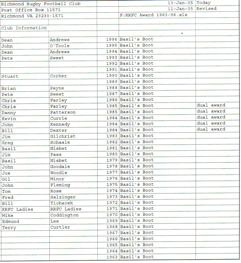 Presidents Coaches Captains Absent Friends Goof Pot Leather Balls Killer B Basil's Boot Most Improved Player Monk Vaughan Most Valuable Forward Most Valuable Back