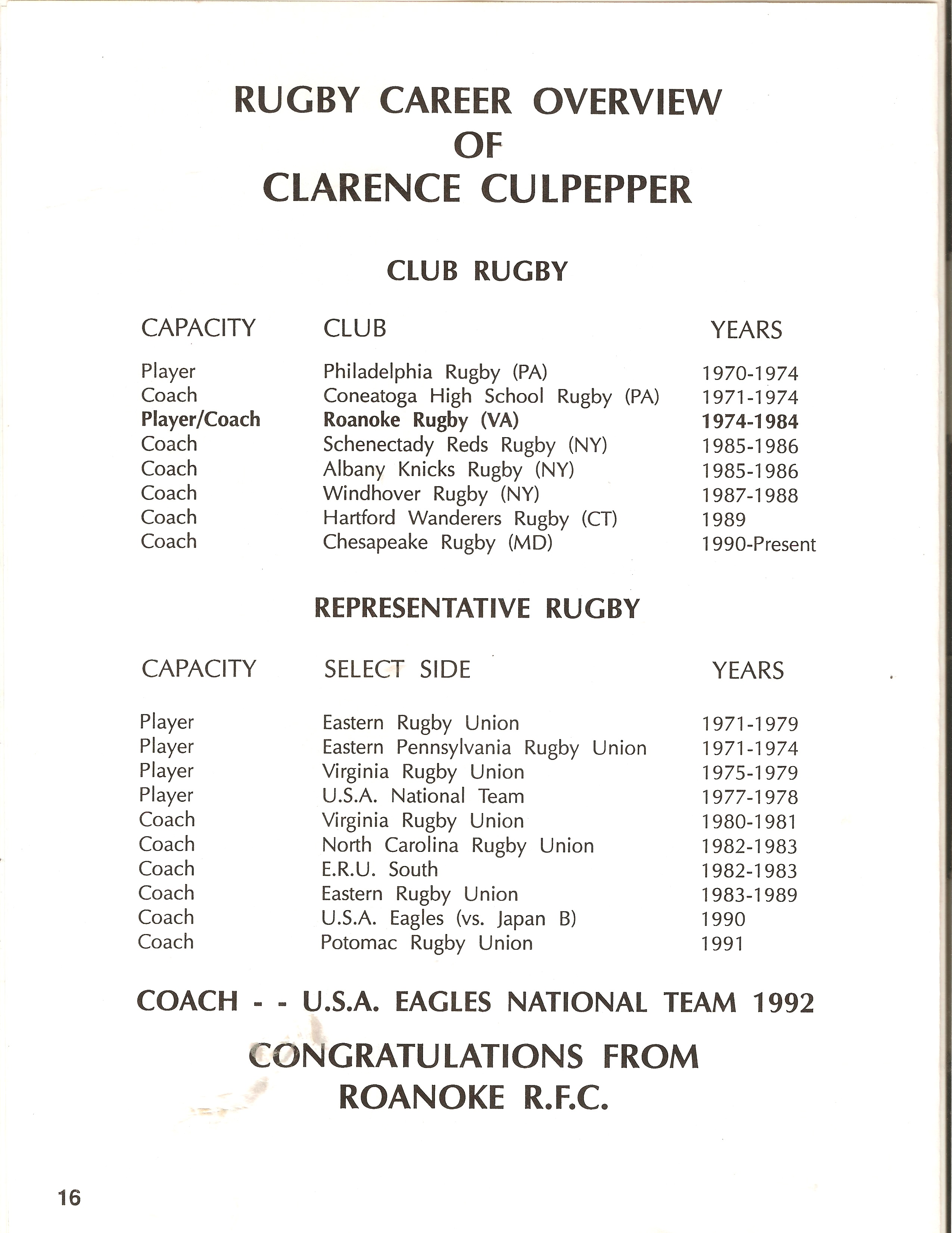 Clarence Culpepper is shown in the backrow with his ears heavily taped.  Clarence taped his ears with lots of tape ever since his return from South Africa in the late 70s when he nearly lost his ear in a ruck but was sewed back on by a skilled medical officer.