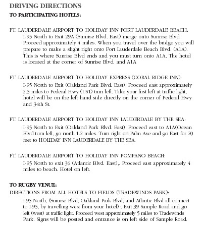 Hotel options are on the web sites. Dan Lonergan's personal favorite is the Holiday Inn Ft Lauderdale Beach. Let your budget be your guide, yet this hotel is in the thick of the social action. There are no $129 rooms left, yet they have $155 rooms as of now. Several players have booked there, several at the Coral Ridge Inn. Once we get an exact count of players, I will post it on the web site. Then we can also make sure we have enough rental cars to get players back and forth from hotels to the park.