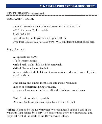 -on friday if we don't see ya at the Coral Ridge,then see ya at 4pm practice Holiday Park,Sunset Blvd friday afternoon, otherwise, catch ya at the Parrott Lounge that evening,otherwise,Sat am at Tradewinds Park ready to play some rugby!