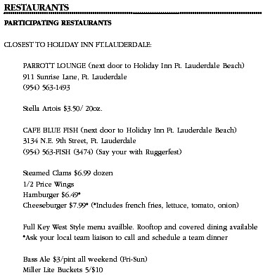 -- Option 1. Kathleen and I are estabishing our headquarters at the Coral Ridge Inn (of late "Holiday Inn Express") and will have a hospitality on friday evening for the players at our room and opportunity for the guys to pick up their kit; we will retire to Parrott Lounge after our 4pm practice for dinner and more hospitality. Call 954 566 4301 for reservations. The Coral Ridge Inn is located about midday between our park and the beach and has favorable rates of $88/night. 3355 North Federal Highway,Ft. Lauderdale.